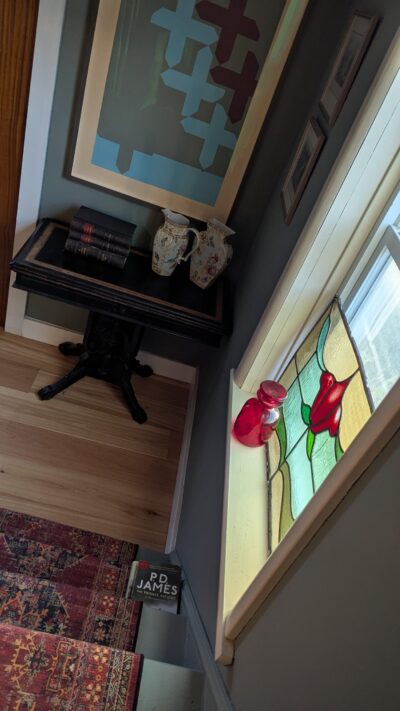 I love this work; it’s currently hanging where I can enjoy it while I sit on the steps with my coffee in the morning. Until I change my mind and hang it elsewhere…either way, we’ll live happily ever after.